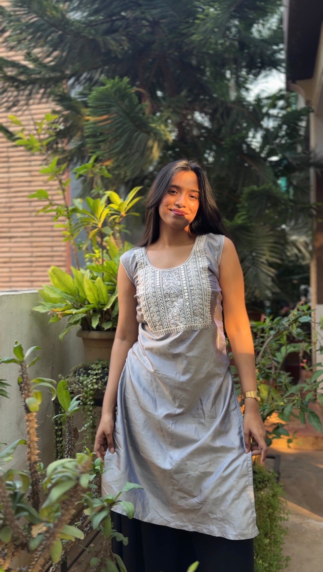 - Color: Soft Grey with White Embroidered Yoke